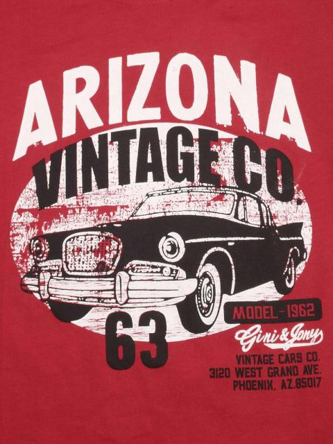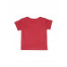 Red round neck T-shirt, made of 100% cotton, has short sleeves, graphic print on the front and brand tag on the hem