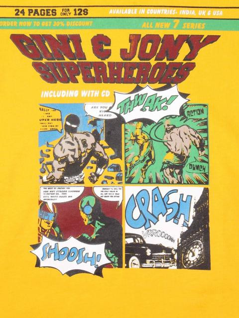 Yellow T-shirt with superheroes print, has round neck and short sleeves