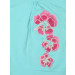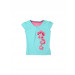 Teal blue round neck top, has cap sleeves, shimmery rubber print and silver embroidery on the front