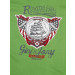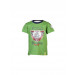 Parrot green round neck T-shirt, has navy blue ribbing around the round neckline, fabric tape detailing around the inseam of the neckline, short sleeves, and a combination of appliqué, print and embroidery on the chest
