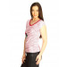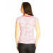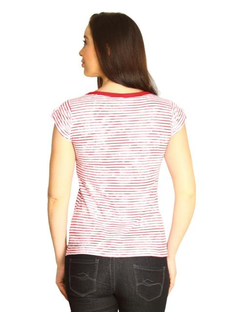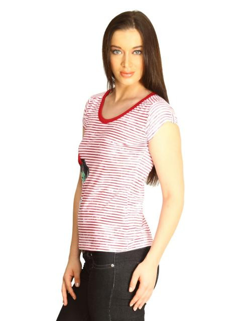 Red and white striped T-shirt, with short sleeves that have a flap over the hem, round neck and graphic print on the right waist