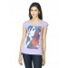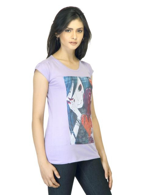 Lavender round neck top made of 100% cotton, has short raglan sleeves and graphic print on the chest