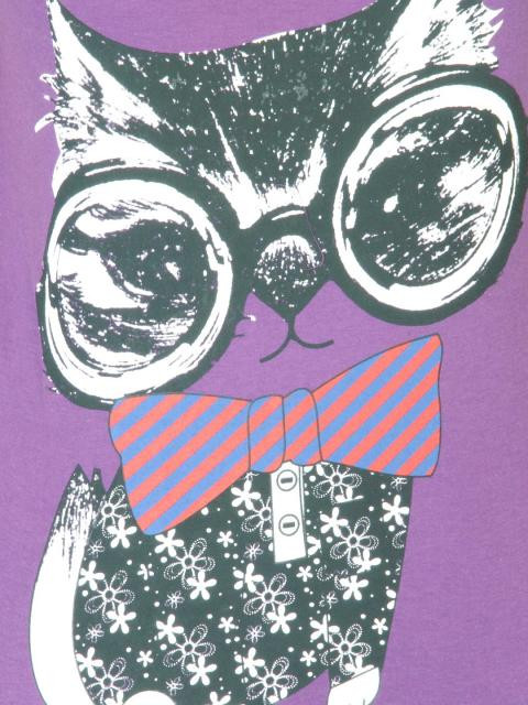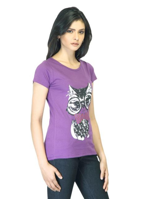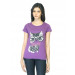 Purple round neck top made of 100% cotton, has short sleeves and graphic print on the chest