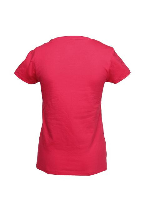 Pink knitted T-shirt, has a V neck, short sleeves and branding above the hem