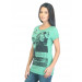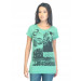 Green round neck T-shirt with a snipped edged neckline made of 100% cotton, has short sleeves with fold over cuffs and graphic print on the front