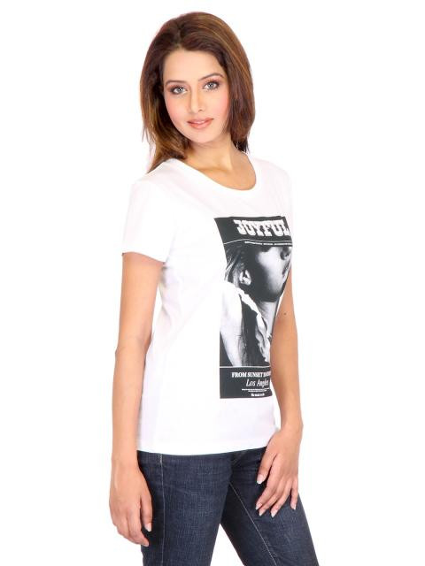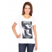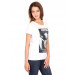 White round neck t-shirt made of 100% cotton, has short sleeves, felt tape lining on the inside of the neck and chest print