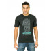 Black T-shirt made of 50% polyester and 50% cotton, has a ribbed crew neckline, short sleeves and graphic lettering on the front