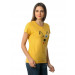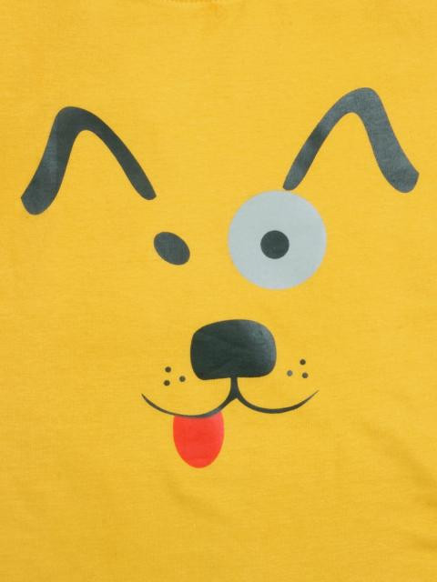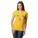 Yellow T-shirt has a round neck, short sleeves with stitch detail, graphic and rubber print on the front