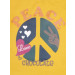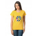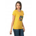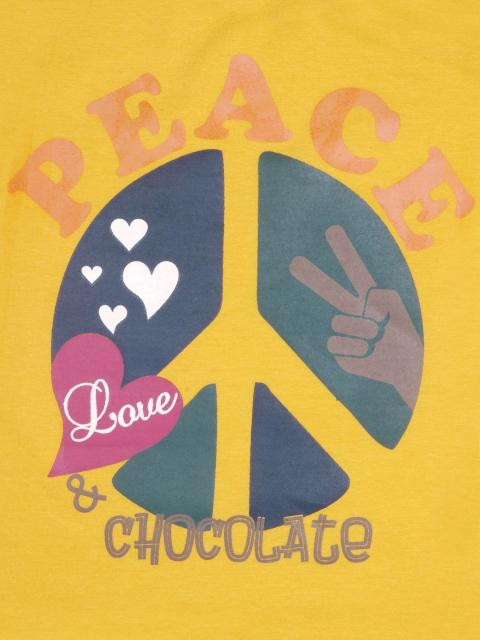 Yellow T-shirt has a round neck, short sleeves with stitch detail, graphic and rubber print on the front