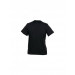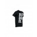 Black round neck t-shirt made of 100% polyester, has short sleeves and graphic print on the chest