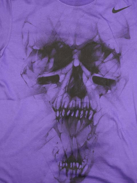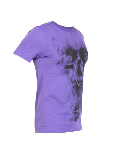 Purple T-shirt made of 58% cotton and 42% polyester, is engineered with Dri-Fit technology, has a round neck, short sleeves, and graphic print on the front