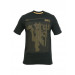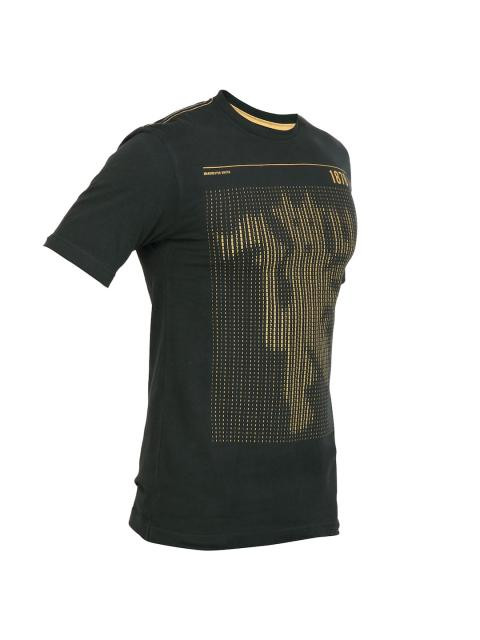 Black T-shirt made of 100% organic cotton, has a round neck, short sleeves, and graphic print on the front