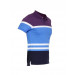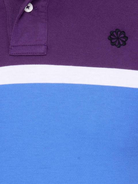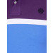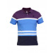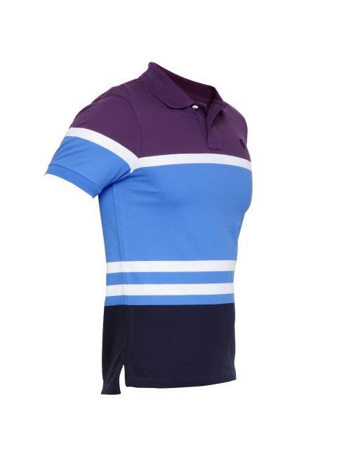 Polo neck T-shirt made of 100% cotton, has purple, white, blue and navy blue bands, short sleeves with ribbed cuffs, ribbed collar with buttoned chest placket, embroidered logo on the upper left chest and vented hems