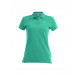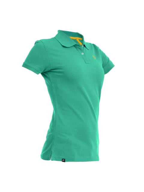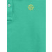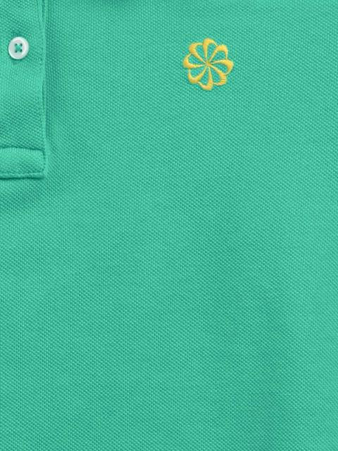 Green polo T-shirt, has a ribbed cutaway collar, embroidered yellow floral detail on the left chest, two button placket, short sleeves with ribbed cuffs and a vented hemline where the back hemline is longer than the front