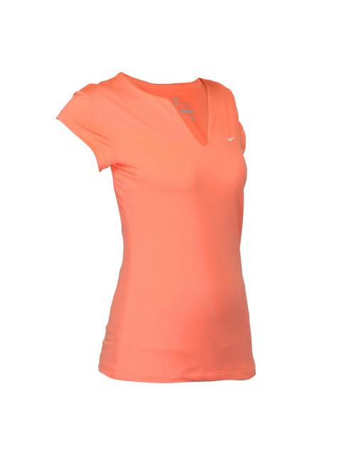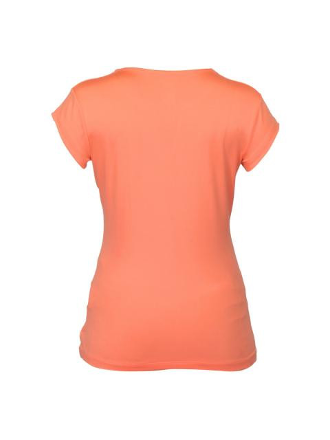 Orange round neck T-shirt for women made of 87% polyester and 13% spandex with a split neckline, engineered with Dri-Fit technology, has short sleeves, nike swoosh embroidered on the left chest