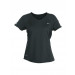 Black round neck T-shirt made of 92% polyester and 8% spandex with a 100% polyester mesh which is engineered with Dri-Fit technology, has short raglan sleeves and nike swoosh printed on the left chest