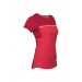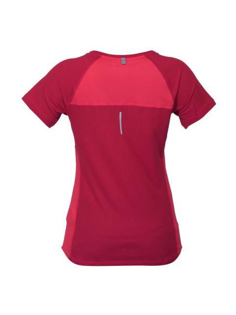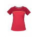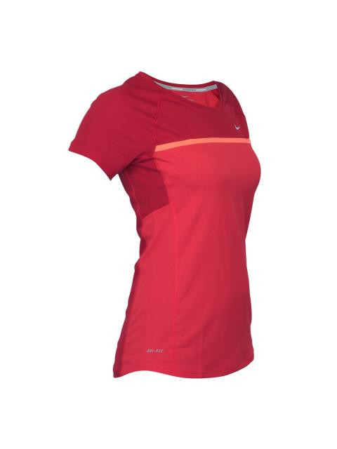 Red round-neck T-shirt for women made of 100% polyester, engineered with Dri-Fit technology, has short raglan sleeves, silver print on the left chest and back and panel on the chest