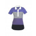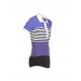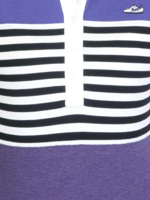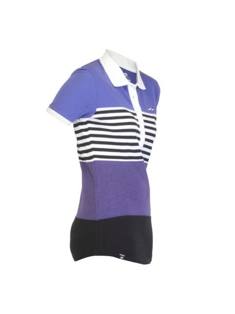 Purple, black and white striped polo T-shirt for women made of 100% cotton, has a ribbed collar with a buttoned chest placket, short sleeves with ribbed cuffs and embroidered nike shoe logo on the left chest