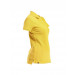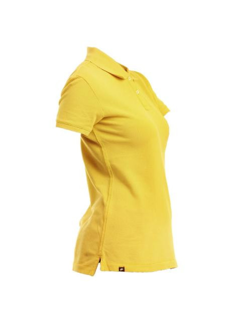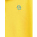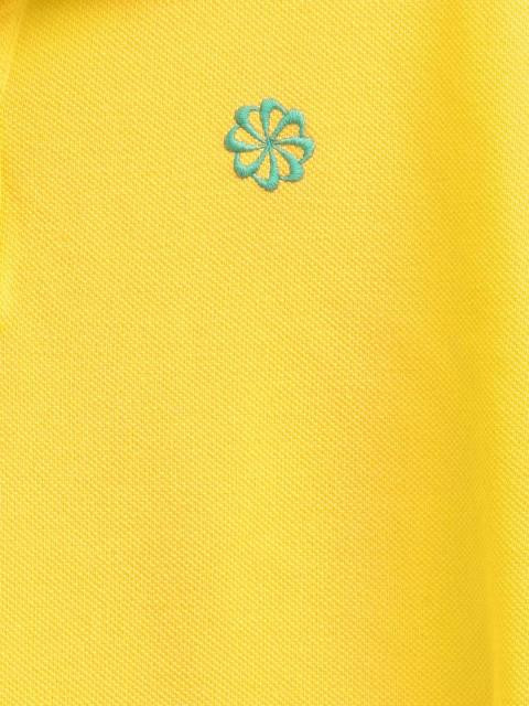 Yellow pique polo neck T-shirt with short buttoned placket, rib knit spread collar, short sleeve with rib knit cuff,embroidery on left front chest, brand patch on right bottom hem, vented hem with back longer than the front