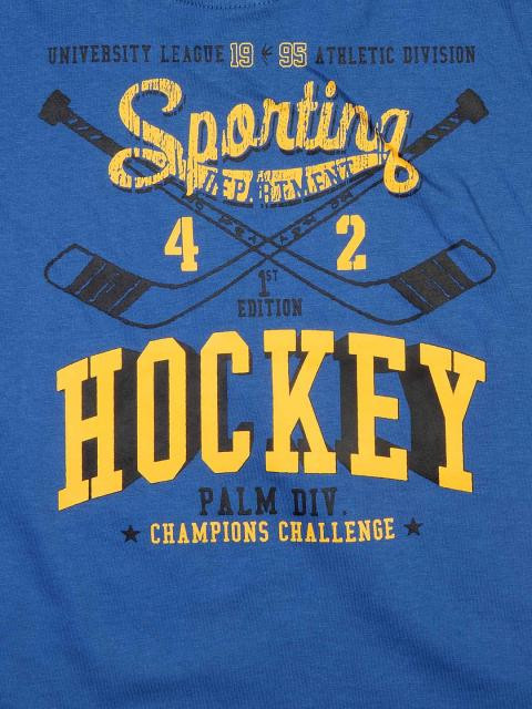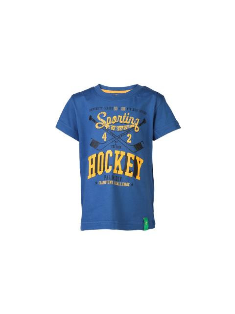 Get your little one ready for action with this dark blue T-shirt from palm tree. The distressed look graphic on the front of the Hockey champions challenge poster gives this an active vibe. Team this with jeans, tees and comfy footwear for a happy, casual outing with his pals, while the pure cotton fabric stays soft on the skin and keeps him fresh and comfortable all day.