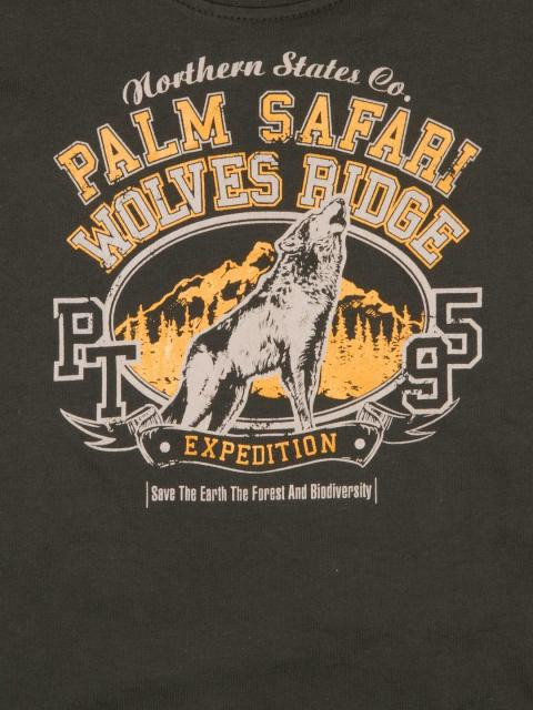 Get your little one ready for the outdoors with this dark brown T-shirt from palm tree. The distressed look graphic on the front of the Wolf Ridge Expedition and the words "Save the earth, the forest and biodiversity" gives this a dose of environment friendly vibe. Team this with jeans and comfy footwear for a happy, casual outing with his pals, while the pure cotton fabric stays soft on the skin and keeps him fresh and comfortable all day.