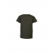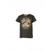 Dark brown T-shirt made of 100% cotton, has a ribbed round neckline with tape detailing on the inseam, yellow stitch detailing on the shoulders, short sleeves, distressed look print on the front and brand tab attached to the left hem on the front