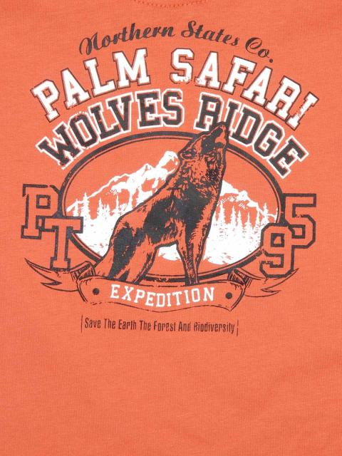 Get your little one ready for the outdoors with this orange T-shirt from palm tree. The distressed look graphic on the front of the Wolf Ridge Expedition and the words "Save the earth, the forest and biodiversity" gives this a dose of environment friendly vibe. Team this with jeans and comfy footwear for a happy, casual outing with his pals, while the pure cotton fabric stays soft on the skin and keeps him fresh and comfortable all day.