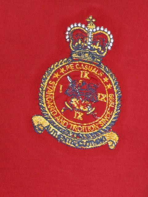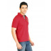 Red polo T-shirt made of 100% cotton, has a ribbed collar, buttoned chest placket, short sleeves with ribbed hems, embroidered brand theme on the left chest and a vented hem
