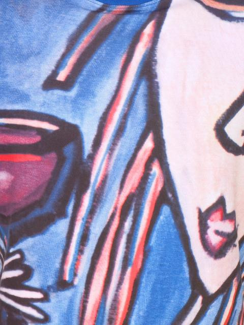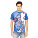 Blue T-shirt made of 100% cotton, has a round neck with velevet tape inseam on the neckline, short sleeves with collection embroidery on the left sleeve and graphic print on the front