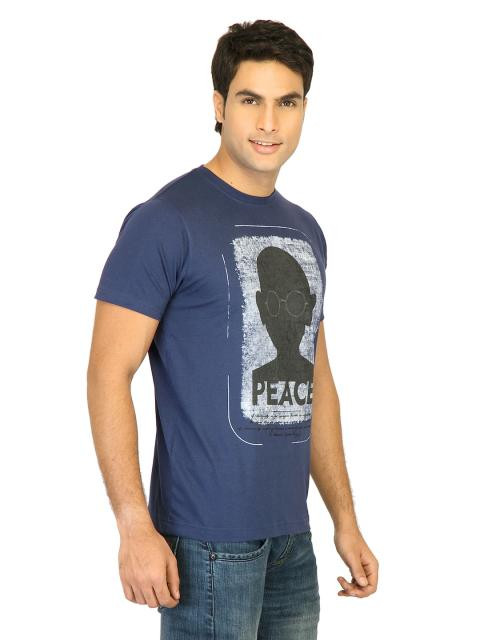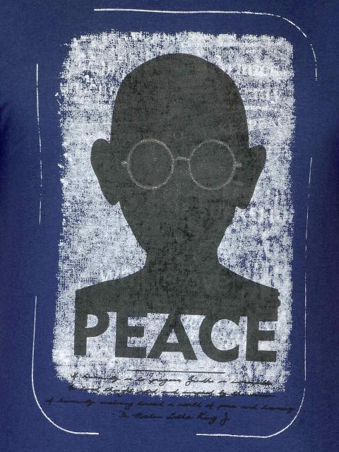 Update your casual style with this navy blue T-shirt from probase. The slightly distressed look graphic print on the front depicting a stylized image of Mahatma Gandhi and the word "Peace" imbibes this tee with a patriotic feel. Team this with jeans and sneakers for a cool look, while the fabric keeps you feeling fresh and comfortable all day long.