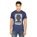 Navy blue T-shirt made of 100% cotton, has ribbing around the neckline and tape detailing on the inseam, short sleeves and slightly distressed look graphic print on the front