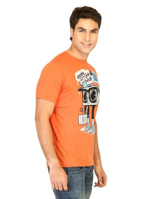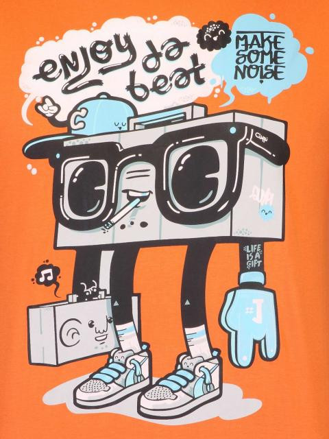Update your casual style with this saffron orange T-shirt from probase. The graphic print of the animated boom-box saying "Enjoy da beat, make some noise" encourages you to do just that. Team this with jeans and sneakers for a cool look, while the fabric keeps you feeling fresh and comfortable all day long.