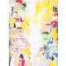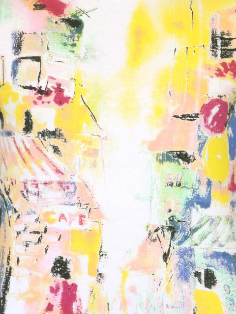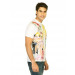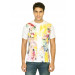 White round neck t-shirt made of 100% cotton that has a round neckline with snipped edges and tape detailing on the inseam, short sleeves, chipped mural look graphic print on the front and yellow stitch detailing on the hems