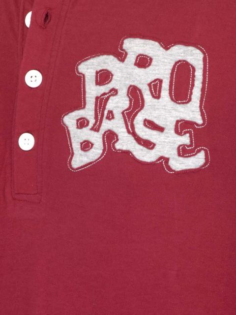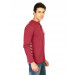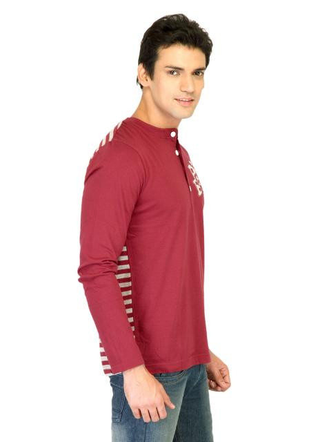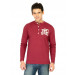 Maroon round neck full-sleeve T-shirt made of 100% cotton, has a short buttoned placket, appliqué on the chest and stripes at the back