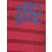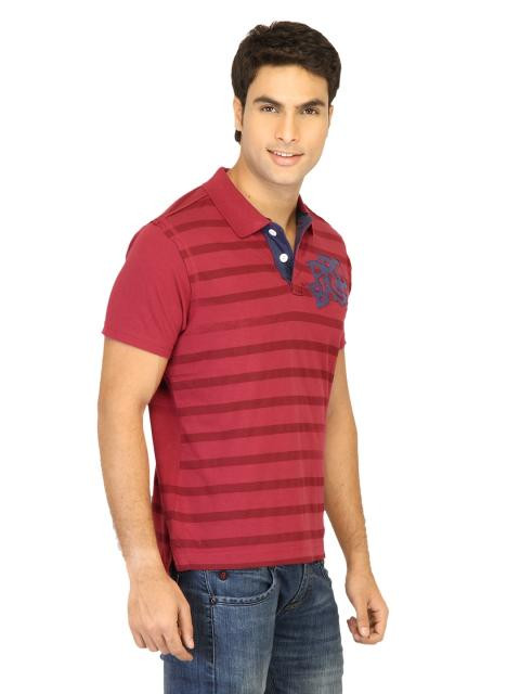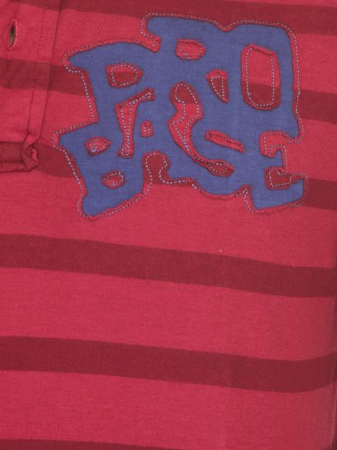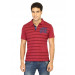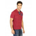 Maroon striped polo T-shirt made of 100% cotton, has short sleeves with thread detailing at the hems, a half buttoned placket, fabric tape detailing on the inseam of the neckline, appliqué on the chest, print at the back and vented hems
