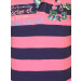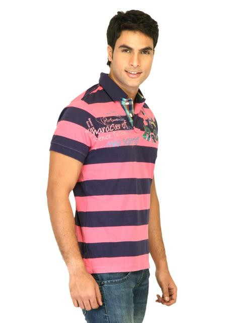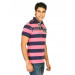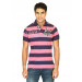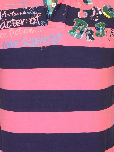 Blue and pink striped polo T-shirt made of 100% cotton, has short sleeves with blue thread detailing at the hems, half buttoned placket, fabric tape detailing on the inseam of the neckline, appliqué on the chest, and a vented hem