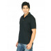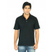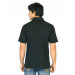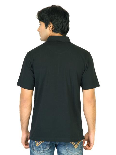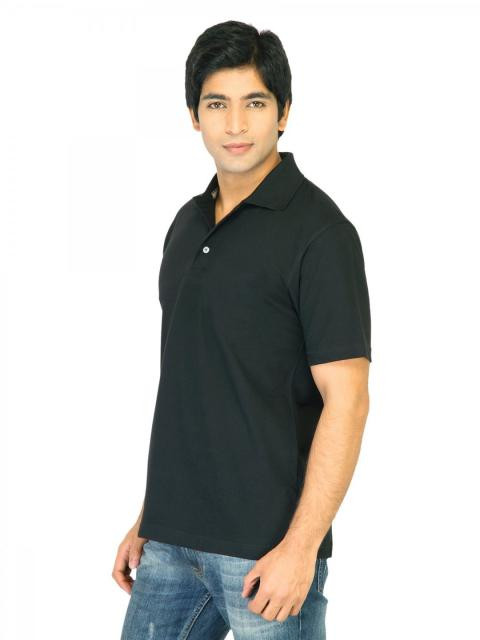 Black polo T-shirt, has a polo collar, short button placket, short sleeves