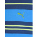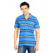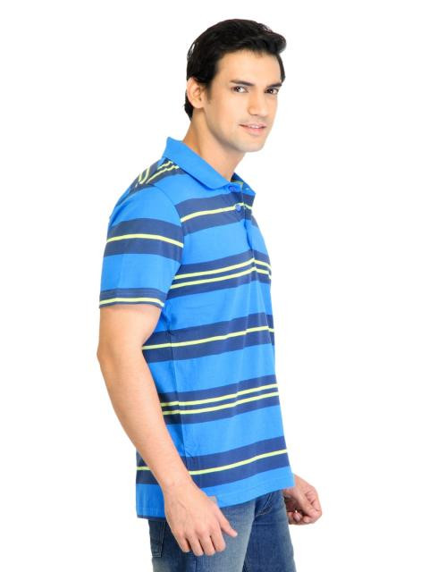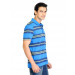 Blue and navy blue striped polo T-shirt with green accents, made 100% cotton, has a ribbed collar with a buttoned chest placket, short sleeves and embroidered brand logo on the left chest