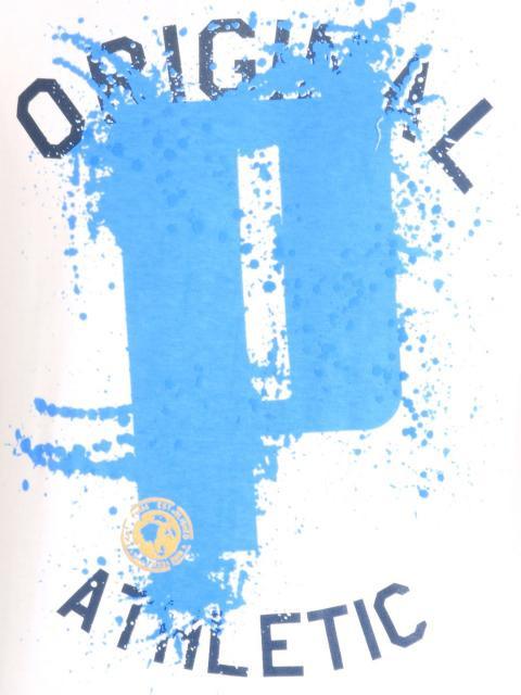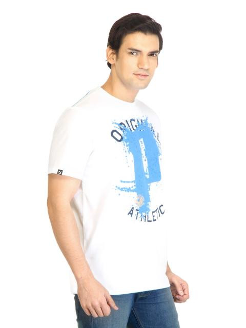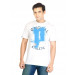White T-shirt made of 100% cotton, has a round neck with fabric tape detailing on the inseam of the neckline, short sleeves, and logo printed on the left chest