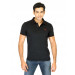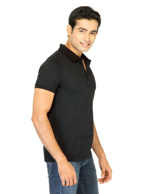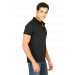Black polo neck T-shirt made of 100% cotton, has short sleeves with a buttoned flap on the left sleeve hem, ribbed collar with a buttoned chest placket, branding on the left chest, and a vented hem