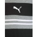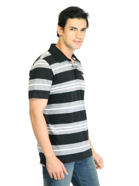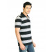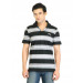 Black, grey and white striped polo T-shirt made 100% cotton, has a ribbed collar with a buttoned chest placket, short sleeves and embroidered brand logo on the left chest