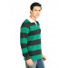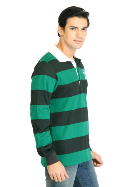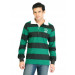 Black and green striped polo neck T-shirt made of 100% cotton, has full sleeves with ribbed cuffs, ribbed collar, buttoned chest placket, and embroidered brand logo on the left sleeve