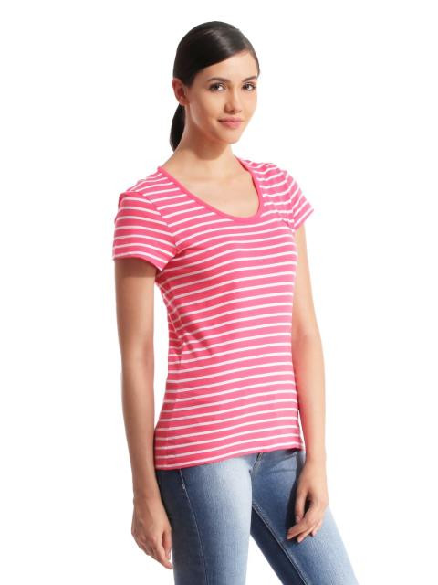 This pink striped t-shirt from puma with an uber cool chest print is a great summery choice. Team it with skinny jeans or denim shorts to make heads turn.