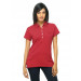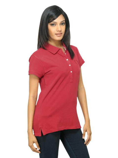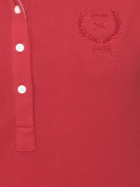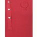 Red polo T-shirt, made of 95% cotton and 5% lycra, short sleeves with ribbed cuffs, chest placket, brand name and logo embroidered on the left chest and has a vented hem