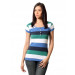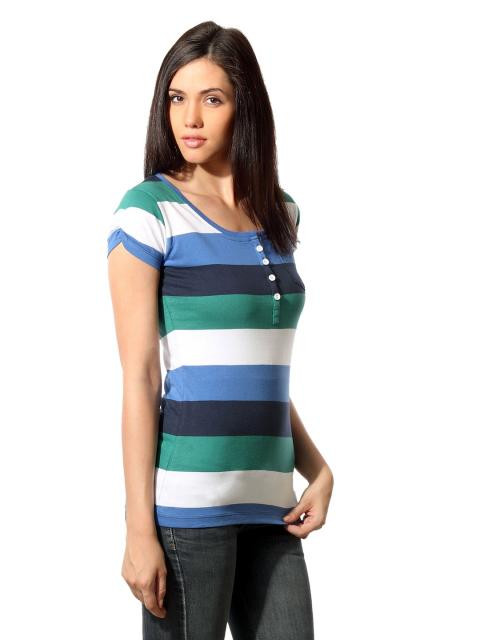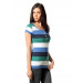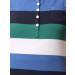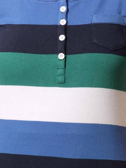White, green, blue and black striped T-shirt,with a round neck, short sleeves, chest buttoned placket, a patch pocket on the left chest and branding appliqued above the left hem