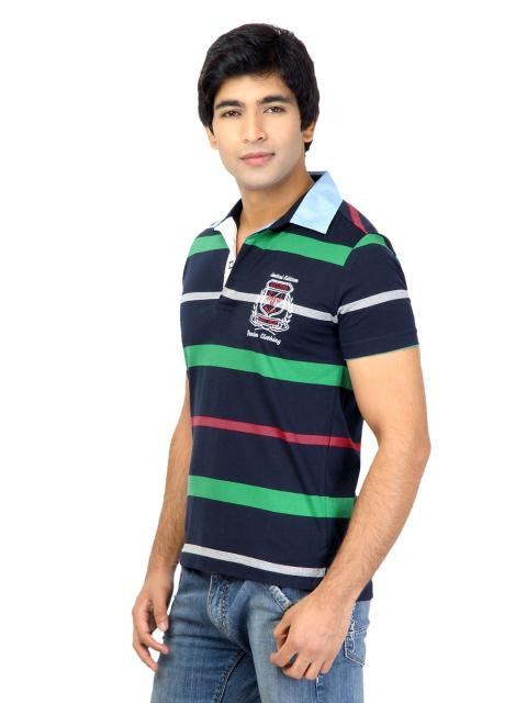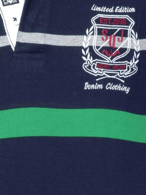 The green, red and grey stripes lend a preppy feel to this navy blue polo neck T-shirt from status quo. The embroidered brand detailing on the upper left chest enhances the brand image. Crafted from 100% cotton, the fabric offers exemplary comfort. Team this with jeans or chinos.