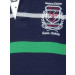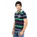 Navy blue polo neck T-shirt made of 100% cotton, has green, red and grey stripes, chambray spread collar, short sleeves, concealed buttoned chest placket, embroidered brand detailing on the upper left chest and a vented hem