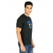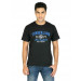 Black round neck T-shirt made of 100% cotton, has fabric tape detailing on the inseam of the neckline, short sleeves, and screen and rubber print on the chest
