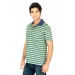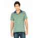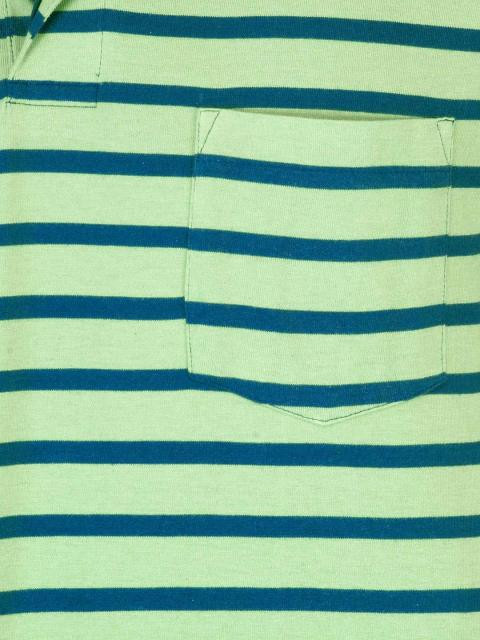 Green polo neck T-shirt with navy blue stripes, made of 100% cotton, has navy blue ribbed collar, short sleeves, concealed button placket, patch pocket on the upper left chest and a vented hem