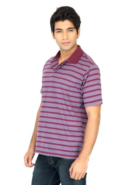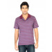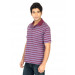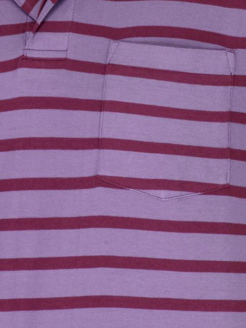 Purple polo neck T-shirt with plum red stripes, made of 100% cotton, has plum red ribbed collar, short sleeves, concealed button placket, patch pocket on the upper left chest and a vented hem